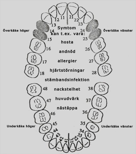 | Ytterligare en mängd störningar än de uppräknade kan förekomma från premolarerna i överkäken. De övriga tänderna ger upphov till andra specifika symtom. För att säkerställa störningar och symtom ska dessa mätas upp med bioelektronisk funktionsdiagnostik (BFD). Ring gärna